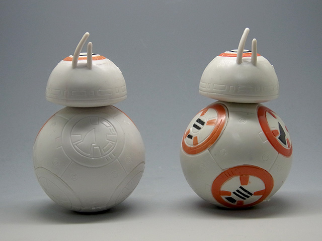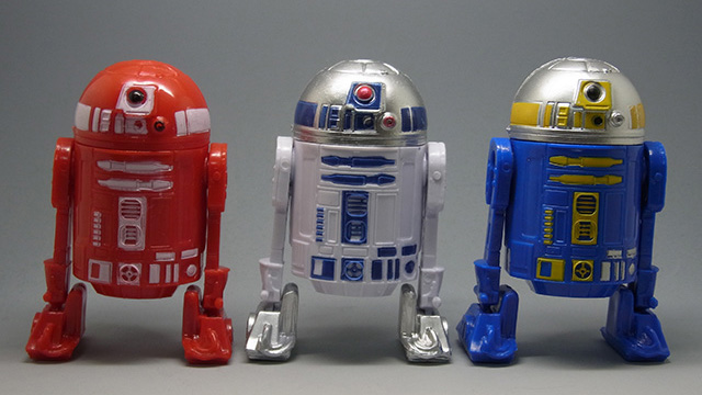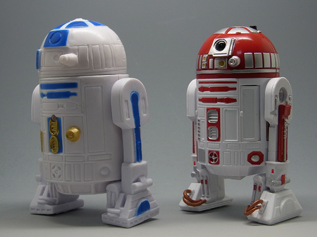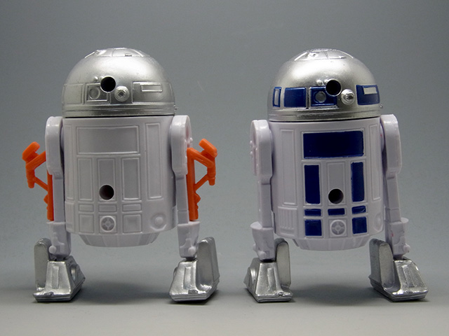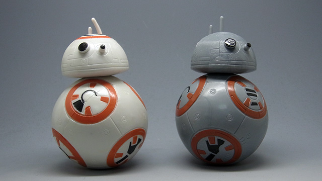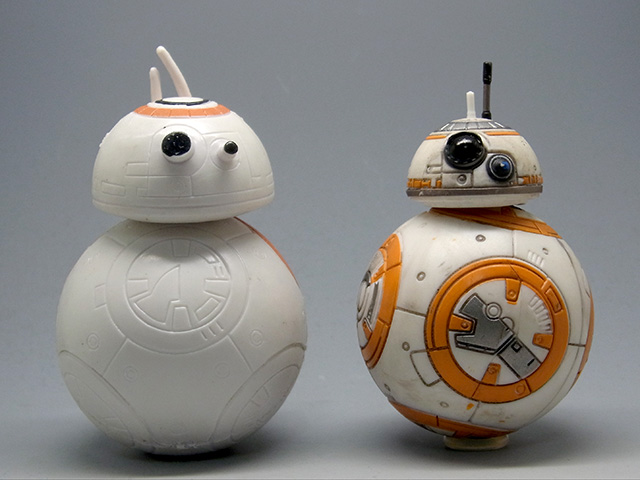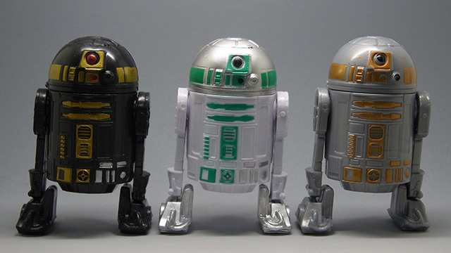 R2-B1(風)だけが気合い入ってるものの、あとの色変えは割とテキトー。まぁやりたいことは分かるんだが。公式にカラーバリエーションがないBB-8は単なる成型色違いで、そこらへんはもっとおおらかというか大胆なニセモノ精神を発揮して欲しかった気もする。こんなとこで萎縮してどうすんの。 |