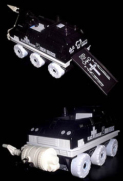 幼少時には(つっても中学生)ほとんど見向きもしなかったレスキュー期のメカの中で、ちょっと気になってたのがこいつ。「これは黒く塗って装甲車っぽくするとイイかも」とか思ってた記憶が、某古玩ショップでこのジャンクを発見した時に蘇ってきたよ。そんなわけで「戦場に散らかった死体を運ぶ霊柩車的なビークル」と勝手に想定して、今回あらためて実現。どうだ、昔のオレ?(>自問)。 分解して白いパーツはそのまま染色し、青いパーツは白塗装したんだが、合わせてみたらちょっと違和感があったので、染めたパーツも若干塗装してある。前部のミサイルランチャーが欠品のため、ジャンクから拾ってきたものをくっつけて完成。最近、デカールのデザインがどんどんダメな方向に行ってる気もしてて、今回は敢えて通常のシールをそのままアレンジするだけにしてみた。やっぱ普通がいいですか。どうでしょう。 で、肝心の「棺桶」になる後部のコンテナは、購入した当初いい気になって遊んでるうちにどっかへ紛失したらしい。マイルームもあなどれませんな、というオチ。ていうか落ちてないですよ。