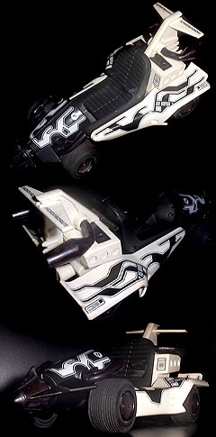 MICRONAUTSのオリジナルメカともいえる『RHODIUM ORBITER』ことゲソマシン改がベース。ボディがダイキャストに変更されると同時にマグネモとフードがオミットされてます。それでもミクロマン用にはだいぶキツいですよコレ。 オリジナルの白いパーツはそのまま生かすことにして、黄色パーツを黒染め。ボディは最後まで迷った挙げ句に白塗装してたんだが、元々のコーティングが残ってたのか、後で吹いたプライマーごとポロポロと剥がれ落ちてきたため、いったん全部シンナーで落とした上で黒塗装にした。くわばらくわばら。