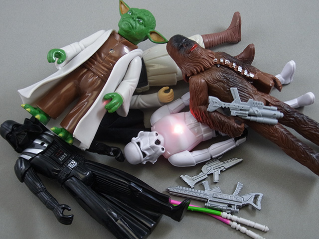 6インチ全6種セットの残骸。みんなベーシックフィギュアをモチーフにしてるっぽい。発光ギミックのスイッチは背面にあるので、寝かせると不用意に発光する。スイッチと言っても要はむき出しのボタン電池に直接LEDの端子を押し付ける単純すぎる仕組み。ちなみに廃棄する際は全部分解してボタン電池を分別した。それにしてもヨーダの怖さが尋常じゃない。